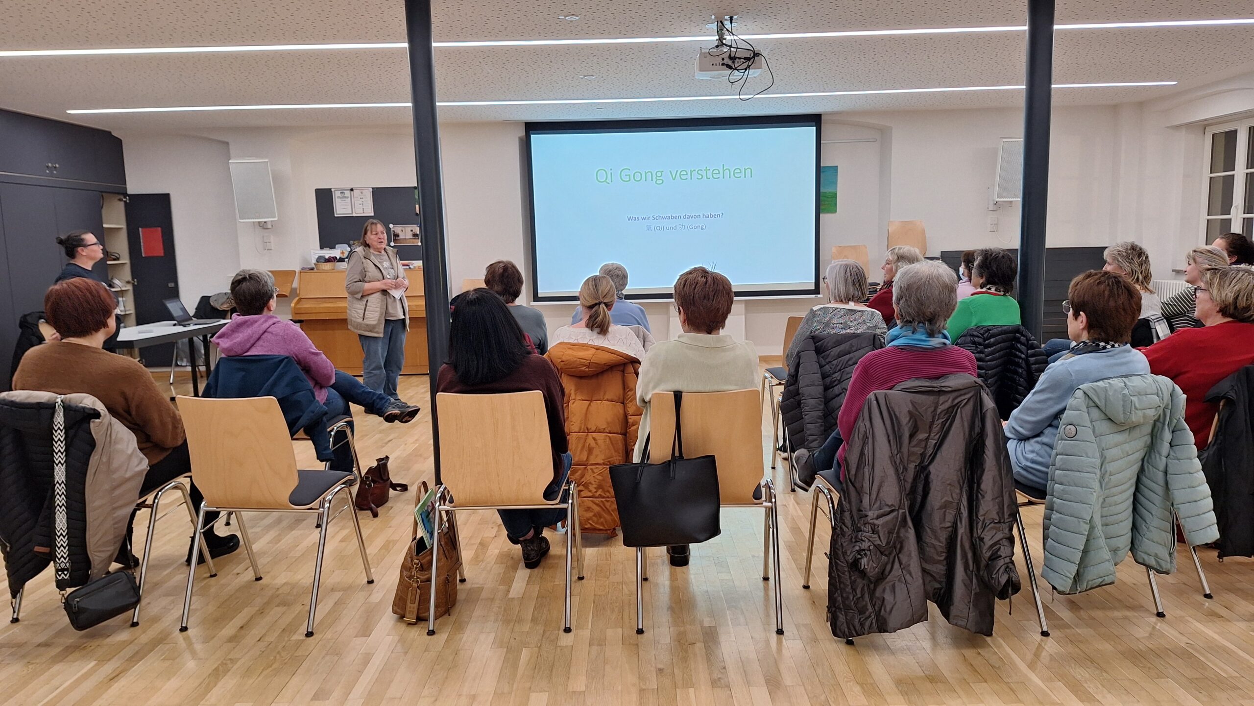Über zahlreiche Teilnehmerinnen konnten sich die Merklinger LandFrauen am 28. Januar zu ihrem Vortrag (mit praktischen Übungen) zum Thema „Qi Gong“ freuen. Auch aus den umliegenden Gemeinden hatten sich interessierte Frauen auf den Weg ins Gemeindehaus gemacht. Unsere zertifizierte Übungsleiterin Raluca Kugler erklärte in einem rund 30minütigen Vortrag den Ursprung von Qi Gong und die Wirkung auf die Gesundheit. Nach einer kurzen Pause durften die Teilnehmerinnen einfache praktische Übungen unter Anleitung ausführen. Nach dieser gelungenen Veranstaltung freuen wir uns sehr, dass sich viele der Frauen gleich für einen Kurs mit Raluca Kugler angemeldet haben.